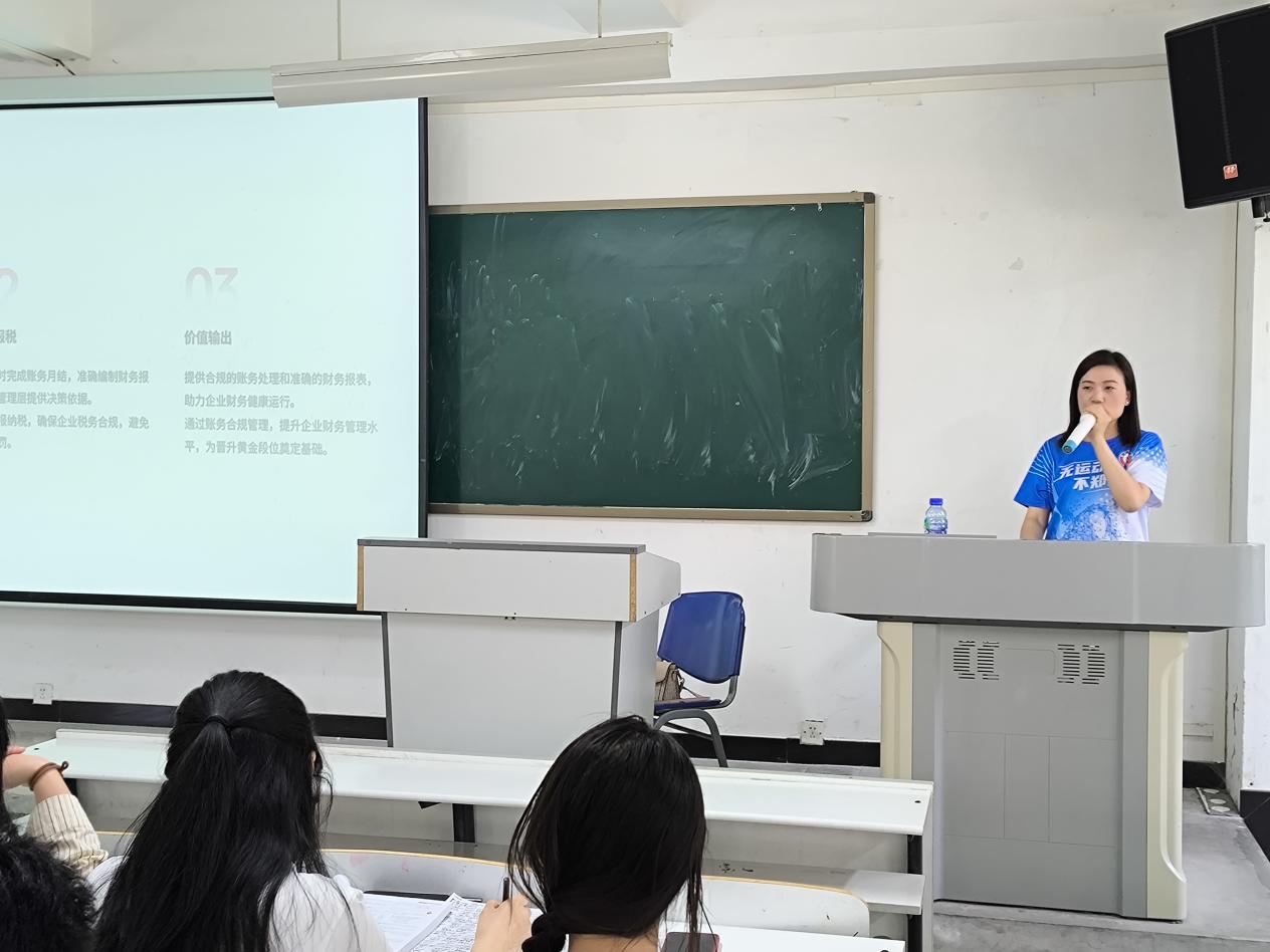 秦新芹校友现任河南数科国际教育咨询有限公司合伙人兼副总经理,曾担任财务高管职务,积累了丰富的行业经验。工作多年后,她凭借敏锐的市场洞察力和扎实的专业能力,成功合伙创办企业,专注于财务咨询与企业管理服务。校友结合自身十四年财务管理从业经历及创业实践,为同学们带来了一场内容丰富、极具启发性的职业规划讲座。