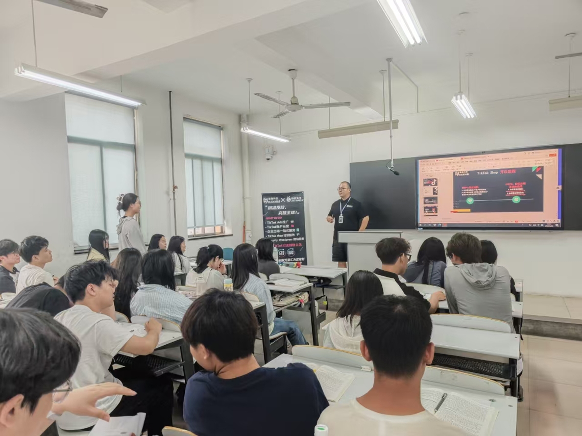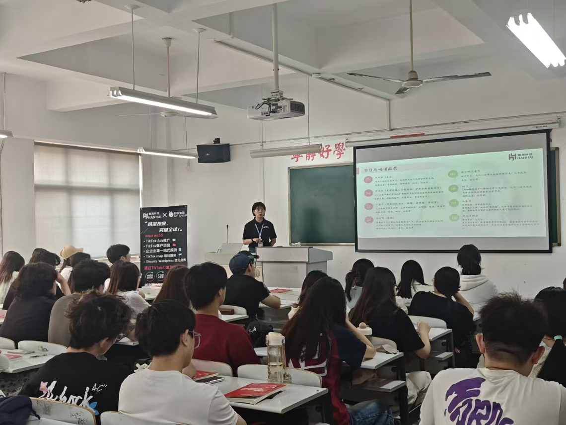 在TikTok专题,瀚海科技运营总监于丽柯凭借丰富的行业经验,从企业运营角度介绍TikTok在全球跨境电商市场的重要地位与发展趋势,并以TikTok海外东南亚市场为例,详细解释TikTok平台的独特算法、用户画像及与其他跨境电商平台的差异,让学生们清晰认识到该平台在拓展东南亚市场方面的巨大潜力。