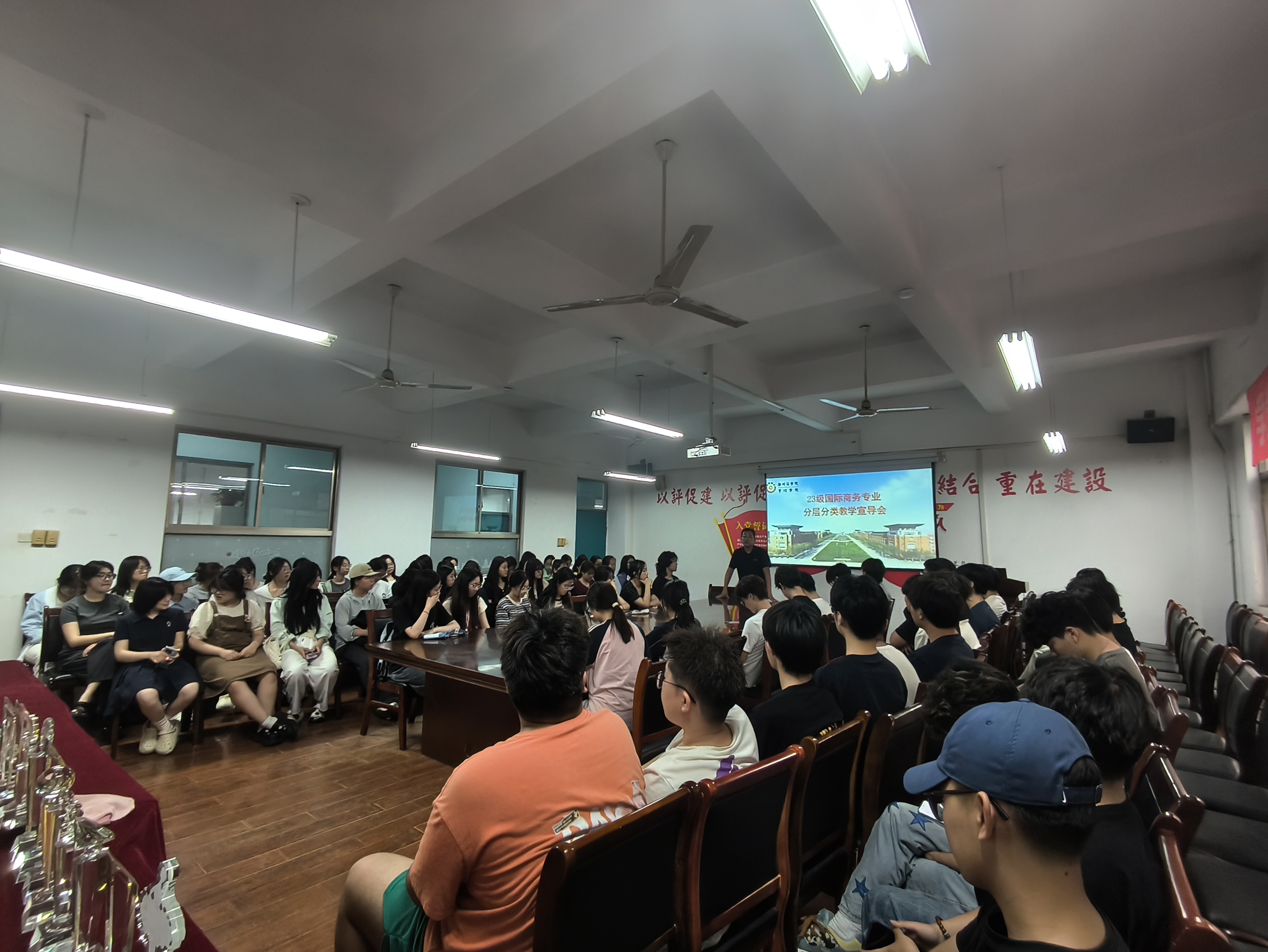 为进一步深化教学改革,提升人才培养质量,落实因材施教、分类教学的理念,充分满足学生的个性化与差异化需求,5月21日晚,我院在2206会议室举行了2023级国际商务专业分层分类教学宣导会。国际商务教研室主任刘法权老师、考研专项教师丁硕,以及2023级国际商务专业全体学生参加了会议。