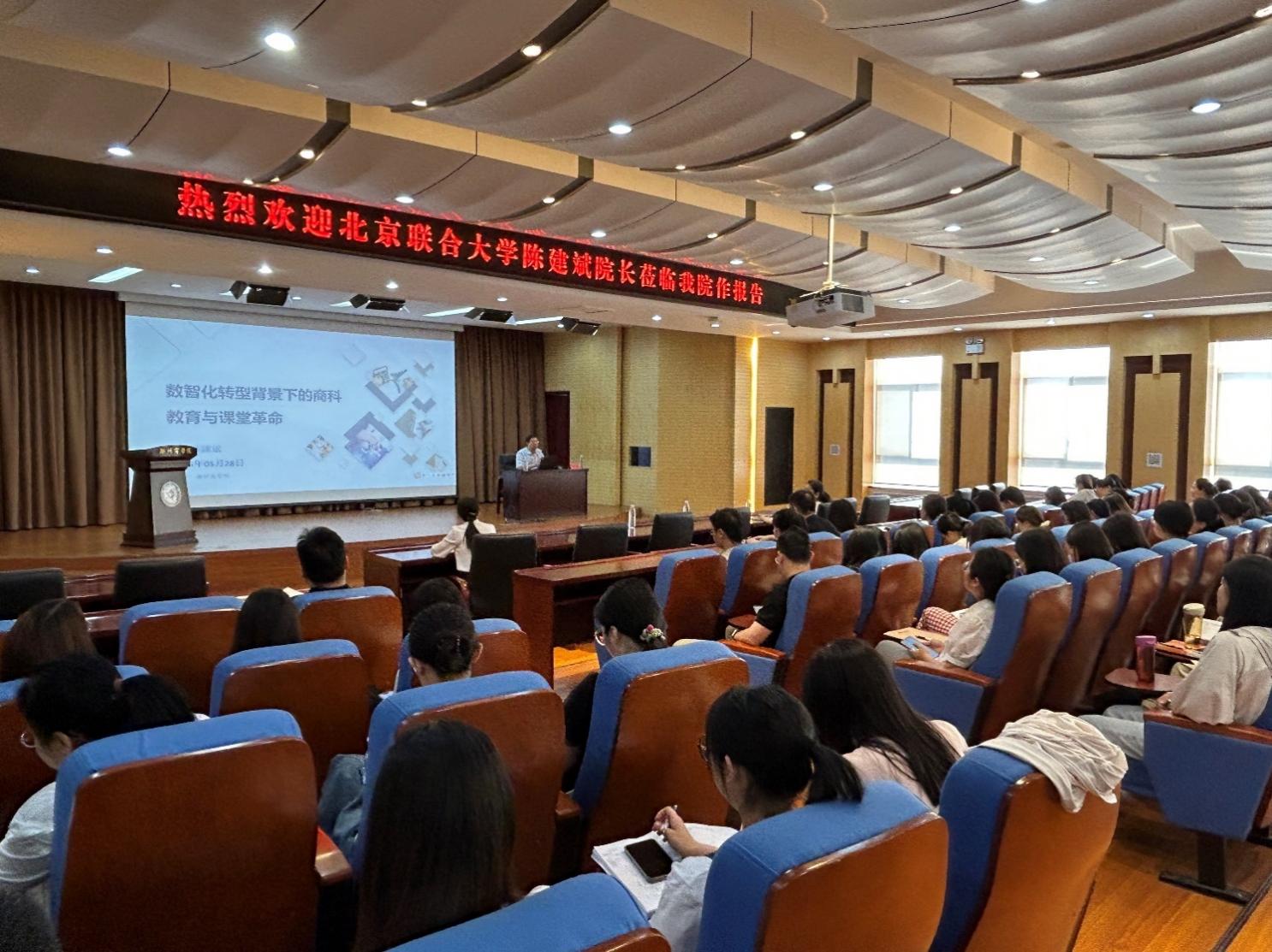 为深化校际学术交流,探索财经学科发展新路径,5月28日上午,我院特邀北京联合大学管理学院陈建斌院长在图书馆五楼报告厅开展“数智化转型背景下的商科教育与课堂革命”专题报告。我院李晓翠院长、张卫丽副院长、全体无课教师及2022级考研班学生参加了报告会,报告会由李晓翠院长主持。