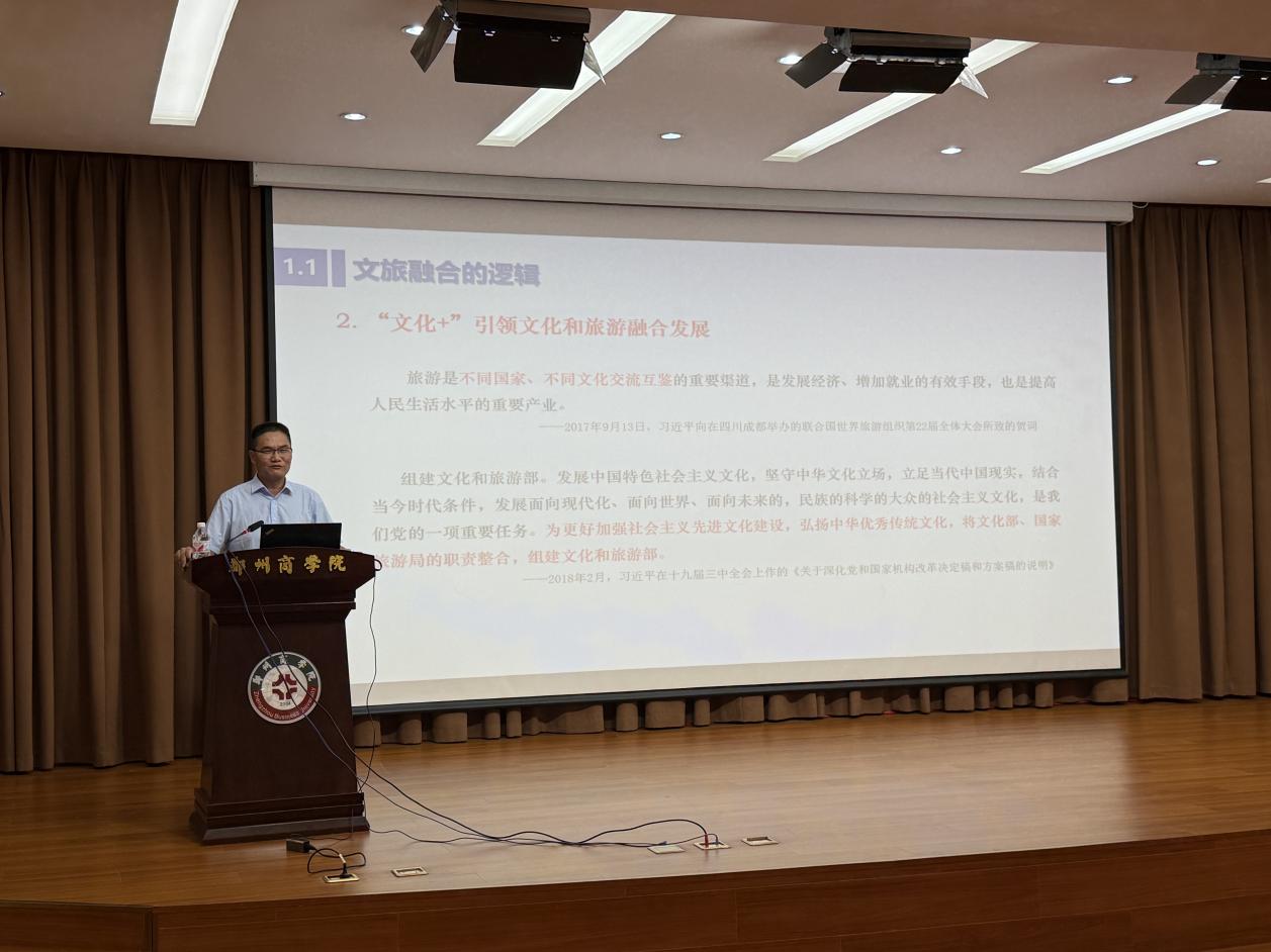 为深化旅游管理专业学科建设,提升师生学术素养,6月18日,我院在图书馆五楼学术报告厅成功举办“文旅融合驱动主题景区高质量发展的理论与实践”专题学术报告会。本次报告会特邀河南大学文化旅游学院副院长、知名旅游管理专家王东峰教授担任主讲嘉宾,为在场师生呈现了一场兼具理论深度与实践价值的学术盛宴。出席本次报告会的有我院李晓翠院长、张卫丽副院长、旅游管理教研室全体无课教师及22级旅游管理专业的同学们,现场气氛热烈,学术氛围浓厚。
