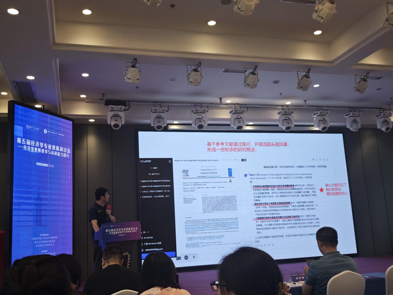 本次会议的亮点有以下内容:中国科学院大学洪永森教授分析经济学实证研究方法的相关应用,以实际数据为基础-提出假设--收集相关变量数据--运用回归分析--实验方法等定量工具--排除干扰因素--检验假设合理性--得出可验证结论。这种方法常见于解释经济现象如价格波动、就业变化等情境。南开大学张晓峒教授以计量经济学课程为例,介绍相关专业建设与课程设计的经验,讲授如何进行课程设计并进行示范教学。研讨会现场就教学目标、课程内容、教学模式、教学方法、教学资源开发等教学与人才培养问题进行交流与研讨。北京邮电大学陈岩教授着重分析基金申报经验,特别强调基金申报需精准匹配对应指南,最好提前半年构思框架。撰写过程突出创新点,用数据支撑研究价值,参考文献兼顾经典与前沿,体现学术脉络。同时还要多请同行前辈提出修改意见,严格把控格式细节,避免出现低级错误。华中师范大学罗恒教授围绕最新前言话题“AI工具赋能科研与论文写作”展开分享,主要分享当代高校教师如何借助人工智能工具,进行高效的数据处理和分析,包括摘要的撰写,英文的灵活使用,文献的综合管理及论文写作发表等。会议最后邀请《经济学报》编辑部王红主任从编辑眼中的好文章视角来进行分享,当今研究背景下如何撰写好文章,其中选好题是重中之重的事情,建议青年教师沿着专一化研究方向不断耕耘。