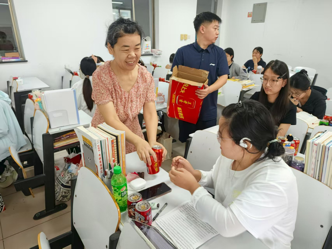 在慰问过程中,领导老师们亲切地与同学们交流,详细询问大家的复习进度、报考院校以及在学习和生活中遇到的困难。学院领导鼓励同学们:“立秋已至,这是收获的前奏。你们在这个暑期的努力,也必将在未来收获硕果。考研的道路虽然艰辛,但只要坚定信念,合理规划,就一定能实现自己的目标。大家在学习的同时,也要注意劳逸结合,保重身体。王老吉可以帮大家清热降火,旺仔牛奶寓意着大家在考研路上一路旺到底。”
