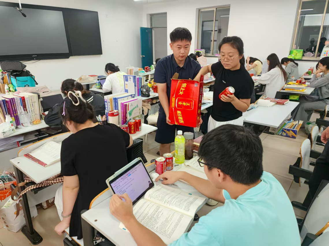 在慰问过程中,领导老师们亲切地与同学们交流,详细询问大家的复习进度、报考院校以及在学习和生活中遇到的困难。学院领导鼓励同学们:“立秋已至,这是收获的前奏。你们在这个暑期的努力,也必将在未来收获硕果。考研的道路虽然艰辛,但只要坚定信念,合理规划,就一定能实现自己的目标。大家在学习的同时,也要注意劳逸结合,保重身体。王老吉可以帮大家清热降火,旺仔牛奶寓意着大家在考研路上一路旺到底。”