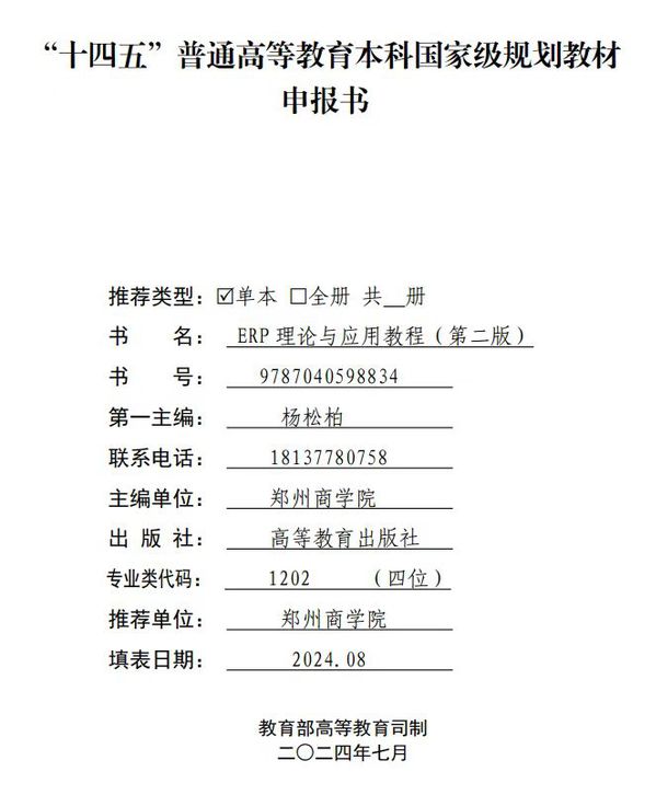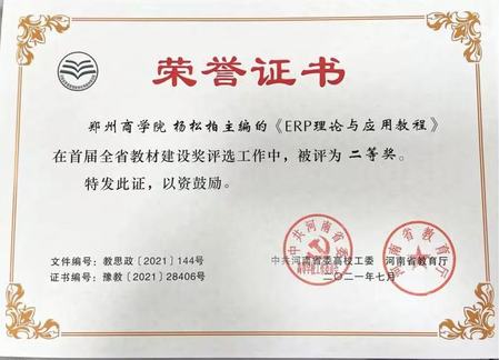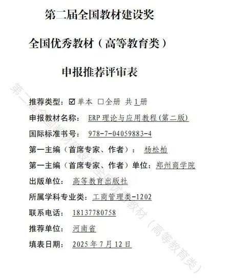 该教材2020年获评河南省“十四五”规划教材、2021年在河南省首届全省教材建设奖评选中获二等奖,并于2024年获推申报“十四五”国家级规划教材、2025年获推参评河南省教材等级评定暨第二届全国教材建设奖全国优秀教材。该教材的建设成果直接支撑了ERP沙盘模拟实验课程的优化与升级,为其提供了坚实的理论依据和实践指导,推动该课程成功获批河南省精品在线开放课程、省级一流课程,并于2025年入选国家级一流本科课程,实现了教材与课程协同共进、理论与实践深度融合的育人新生态。