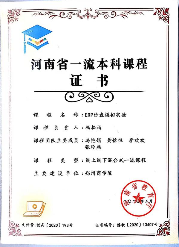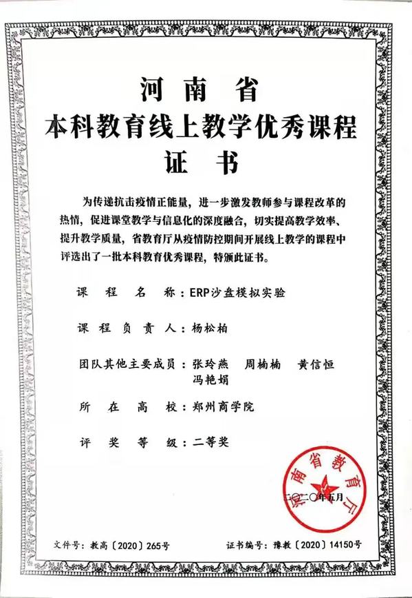 2020年 | ERP沙盘模拟实验 | 河南省本科教育线上教学优秀课程二等奖 |