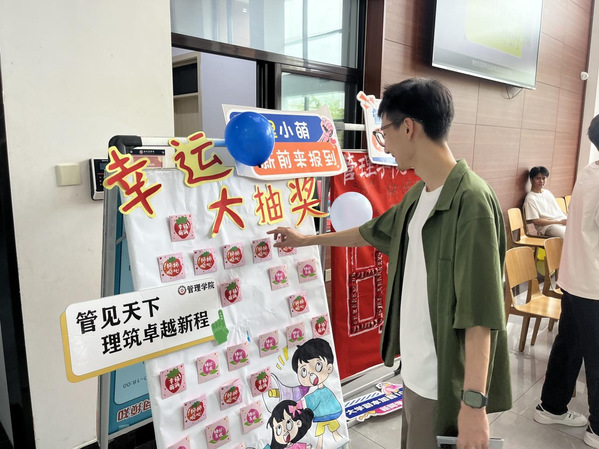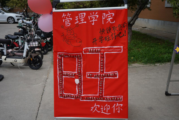 我院亚泽楼和宿舍楼下,悬挂着“管理学院欢迎你”“迎八方学子,共赴知识殿堂;聚四海英才,同筑青春华章”的横幅,放置安全提示、报到流程等海报,还有抽取盲盒和礼物领取等互动环节,为新同学们营造出温馨而热烈的氛围。