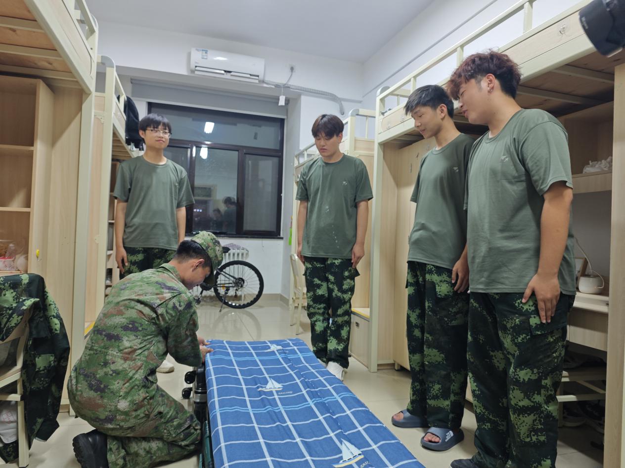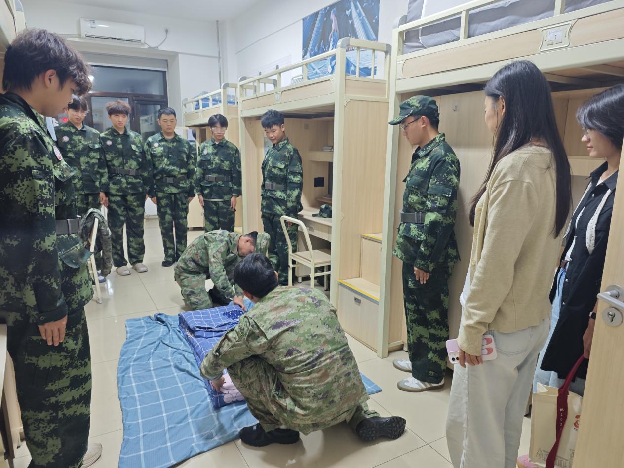 学生内务整理作为军训的重要内容之一,9月17日晚,我院2025级全体新生正在各个宿舍有序推进。我院团委书记朱赛楠带领各连队教官及辅导员老师逐一走访新生宿舍。
