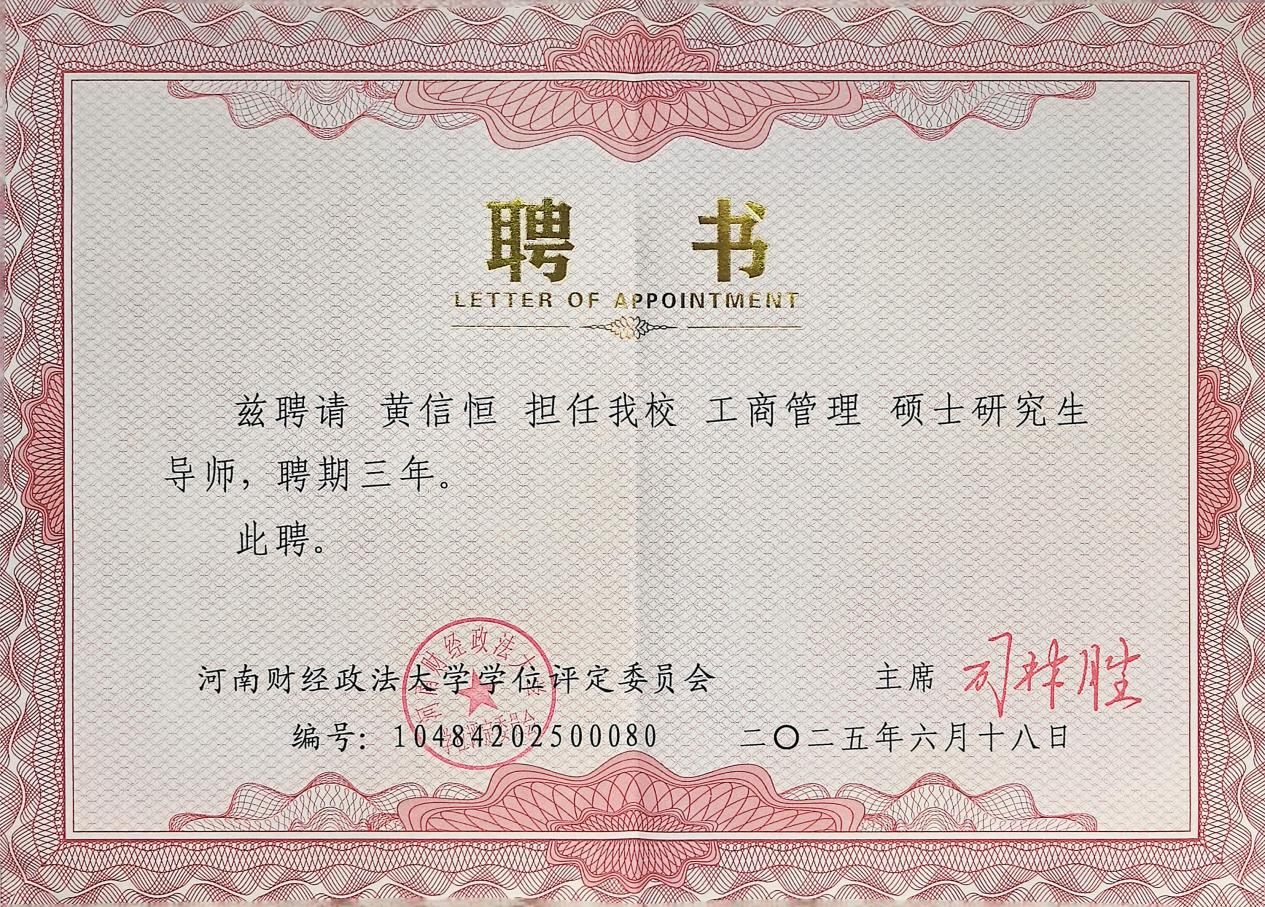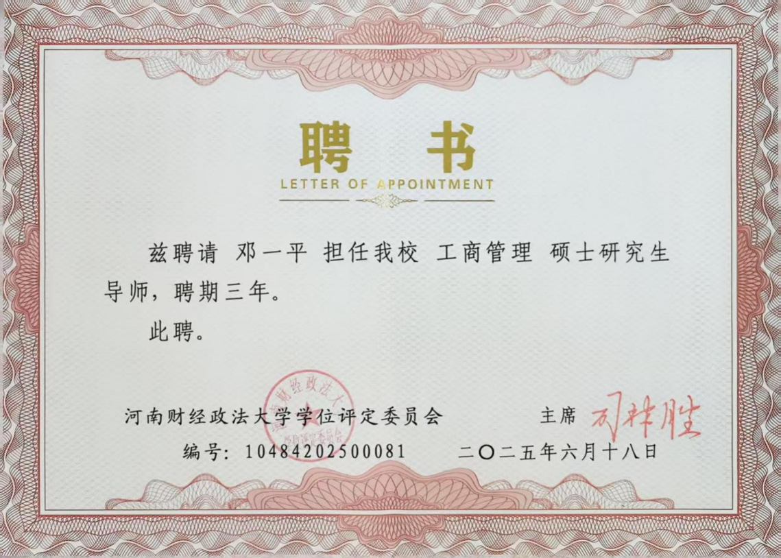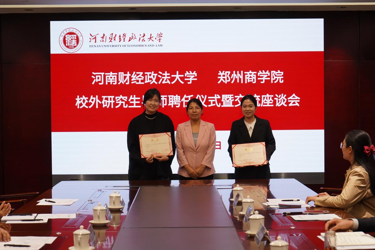 在导师聘任环节,蔺全丽副处长代表河南财经政法大学向beat365唯一官网管理学院教师邓一平、黄信恒颁发硕士研究生导师聘书,将加入管理学部王永伟部长与研究生处杨凯瑞副处长团队,深度参与学术规划、论文指导等关键具体环节,助力研究生培养工作。
