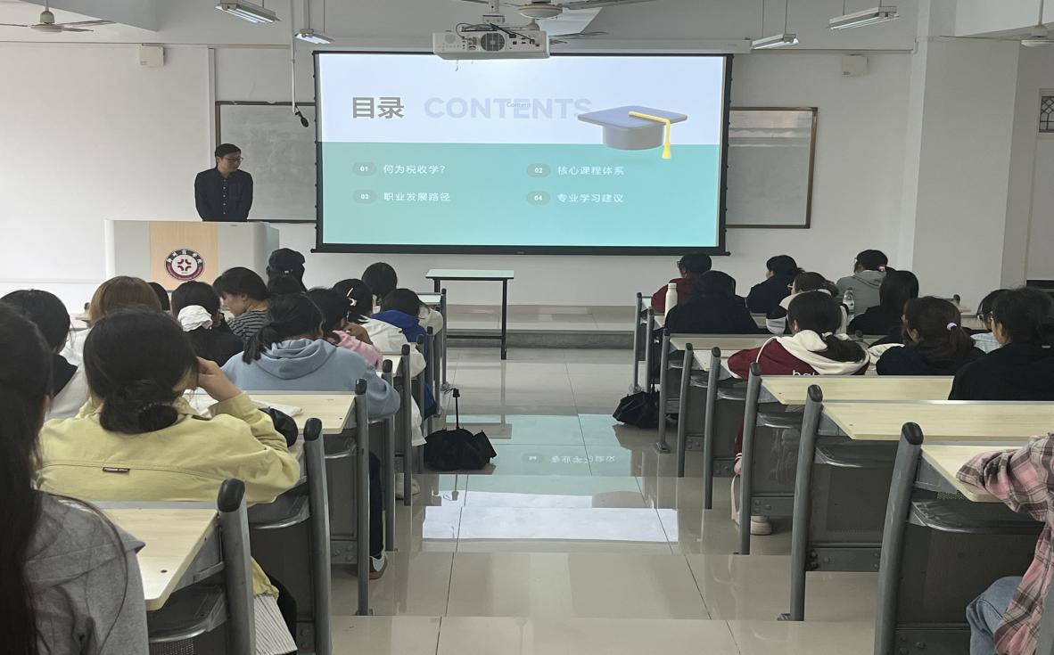 税收学专业专业教育由李鸿春老师主讲,在专业介绍环节,李老师从学科定义、课程体系、职业方向及学习建议四个维度深入讲解,着重强调了税收实务能力培养与职业规划的重要性;互动环节中,新生们踊跃提问,李老师结合行业发展趋势与个人发展需求,逐一给予针对性指导,有效解决了新生的困惑。