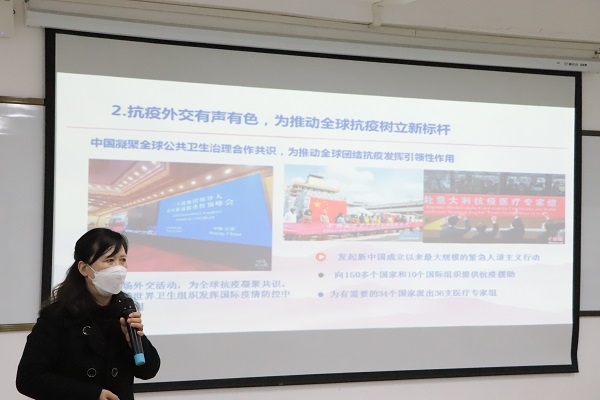 首先,张冬芬教授阐述了我国自改革开放以来所不断变化的外交政策,从十一届三中全会所提出的独立自主、对外开放到20世纪90年代初期我国领导人所提出的韬光养晦、有所作为的战略方针,以及十八大之前所提出的和谐世界、互利共赢的外交政策再到当今的中国特色大国外交。我们的党始终深刻把握国内的基本情况,不断扩大对外交往范围,把握时代主题,紧跟时代潮流。最后张冬芬教授告诉同学们“不忘跟党初心、牢记青春使命” 是党和国家给予青年的历史重任与殷切期望。作为一名青年,作为一名入党积极分子,我们必须努力充实自身,提高专业能力与个人素质,发挥带头模范作用,助力国家发展。