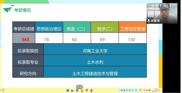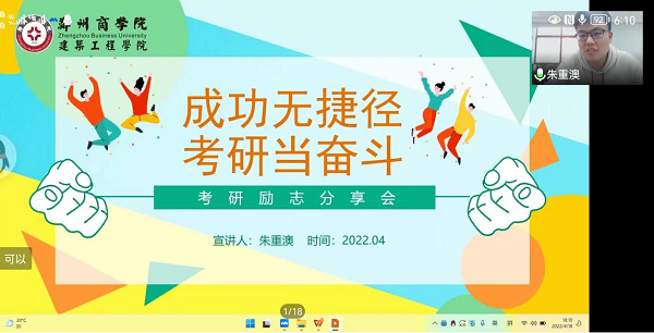为进一步帮助建工学子明确本专业的就业方向和发展前景,增加对相关专业考研形式的了解,促进同学们的学习热情和考研热情。我院于2022年4月18日晚18:00通过腾讯会议邀请考研上岸的18级学长朱重澳为同学们主讲“考研励志分享会”活动。