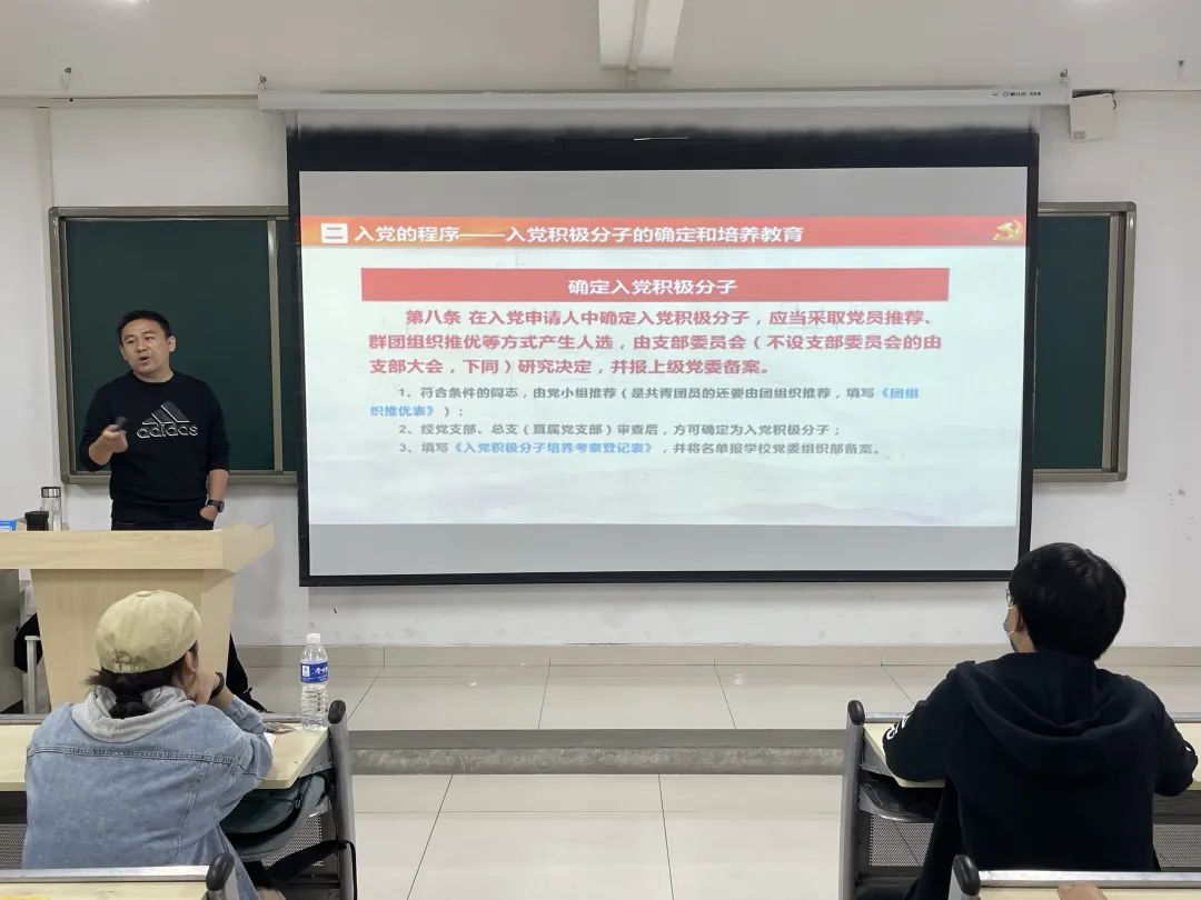 培训伊始,刘帅书记紧扣中国共产党的章程相关条例,从入党条件及入党程序两方面有条不紊地开展。刘帅书记直观具体的党课让同学们更深入地了解到要成为一名党员所应具备的条件及入党流程,逐步详细地阐述了中国共产党发展党员的四个阶段及具体要求,并讲解了入党积极分子的确定和培养,发展对象的确定及考察,预备党员的教育、考察和转正等内容,进一步讲明了党员的权利和义务。最后,对同学们党课学习中的相关问题进行答疑,让同学们对党的发展程序的相关知识有更深刻的了解。