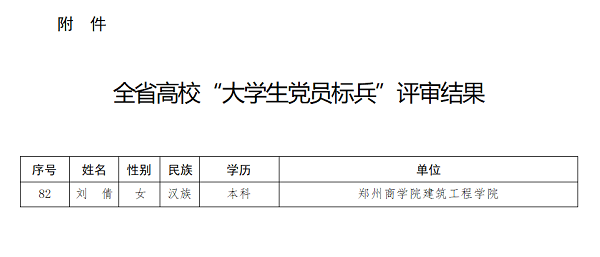近日,河南省教育厅办公室下发《关于开展全省高校“大学生党员标兵”选树活动的通知》(豫教工委办〔2022〕39号),在各高校遴选、推荐、公示的基础上,省委教育工委组织专家,对各高校推荐的“大学生党员标兵”人选进行了评审,建工学院第五学生党支部刘倩同志荣获“2022年全省高校大学生党员标兵”荣誉称号。