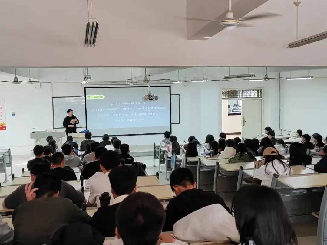 刘志岭老师根据自己的参赛经历,从“挑战杯”比赛的内容、流程和注意事项等方面分享自身宝贵的科研经验。刘志领老师从他的参赛经历入手,向同学们讲解了他从大一开始参加大学生挑战杯的经验及感受:从建立小组、确定选题思路、实地调研、调研市场等多方面给同学们讲解其中的细节,他鼓励在场的同学积极参与,“做竞赛”别管结果怎么样,参与的过程就是一段很美好、又值得回忆的经历。最后,他呼吁同学们:“少一些功利主义的追求,多一些不为什么的坚持。”此次“挑战杯”经验分享会在同学们经久不息的掌声中圆满结束。