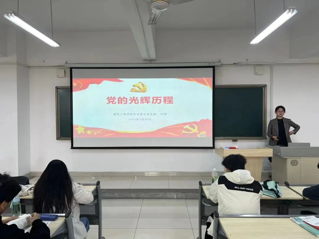 建工学院学生第五党支部书记刘珲同志在讲述党的光辉历程时,从发展脉络及学习意义,新民主主义时期,社会主义建设时期,改革开放和中国特色社会主义道路,弘扬新时代奉献精神五个部分进行讲解。刘珲同志在课堂上带领同学们重温了那段红色的历史,告诉同学们历史是最好的教科书,中国革命历史是最好的营养剂。学习党史、国史,是坚持和发展中国特色社会主义、把党和国家各项事业继续推向前进的必修课,积极分子们要从党的百年历史中吸取奋进新征程的磅礴力量。