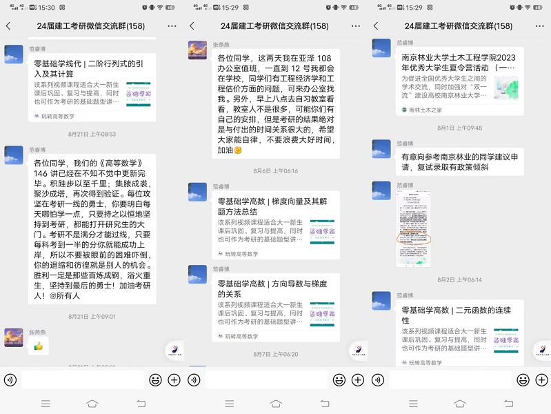三是全力做好考研外围辅助及资源支持。学院孙利民院长、朱宏东书记暑期多次深入学生一线,关心关注学生学习生活状况;张燕燕副院长协调各方资源,积极联系省内外目标院校为学生开展主题讲座;考研教研室及指导教师认真谋划新学期考研工作计划,建立重点工作日程卡,确保及时解决学生各项需求,为学生考研成功提供助力。