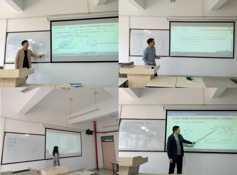 首先,五位教师分别从各自所讲授的《工程力学》、《建筑设备》、《工程项目成本管理》以及《工程造价管理》课程中选取部分章节进行15分钟的说课,从教学目标、主要任务、基本要求和具体教学内容等方面进行了全面展示,其余教师认真听课并做好记录,对整个授课过程的教姿教态规范化、课程设计合理化和板书内容提炼精细化等方面分别进行点评。