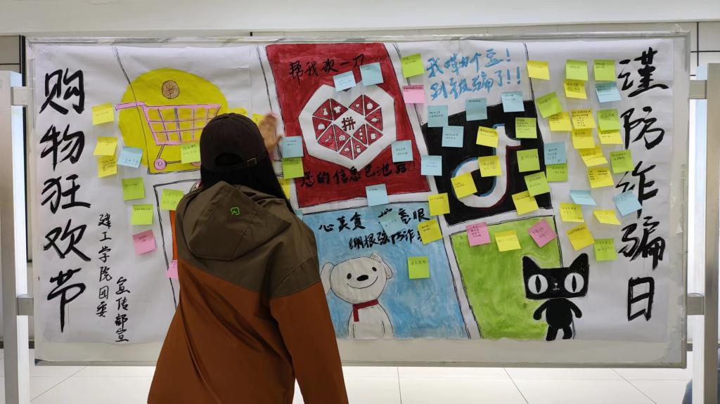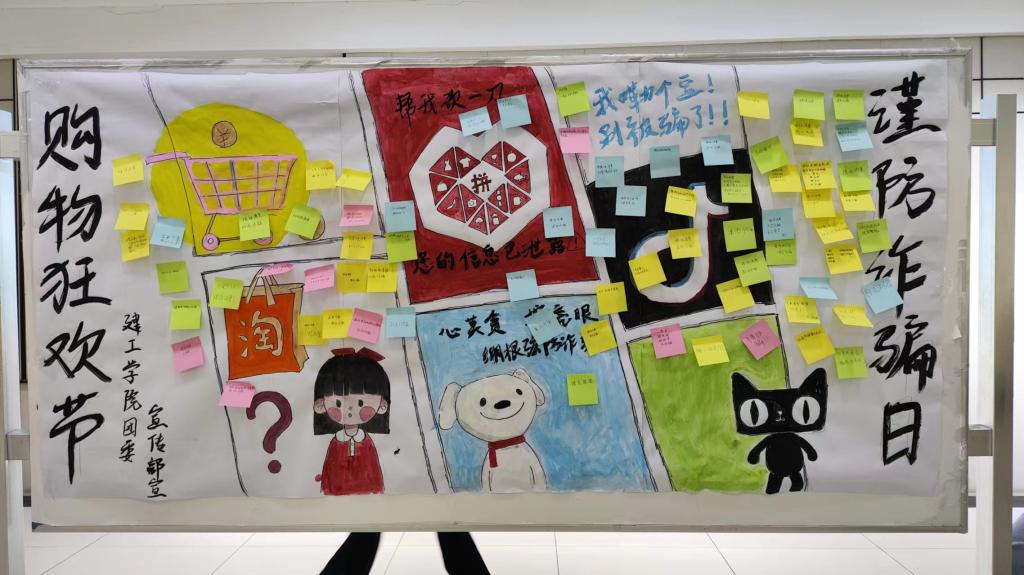 为了提高我院学生的反诈意识,在“双十一”购物节期间保障广大学生的财产安全,由建筑工程学院权益部举办的“购物狂欢节,谨防诈骗日”主题板报活动于11月10日在亚泽楼举行。