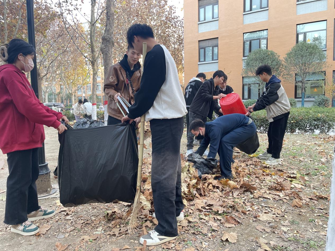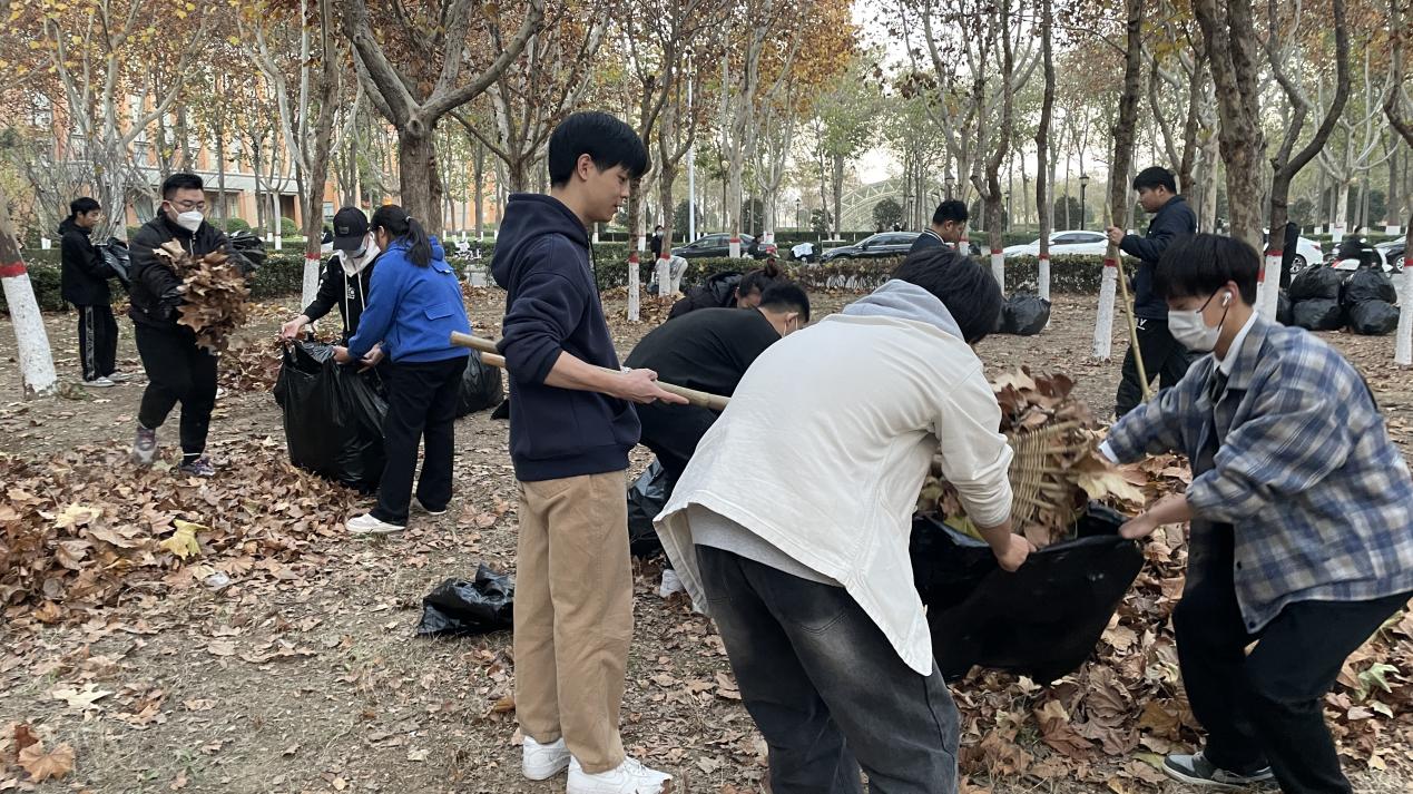 活动开始前,辅导员和班委对劳动区域、劳动内容进行了分配并强调了安全事项,在鼓舞了干劲儿后,同学们分三组井然有序地领取劳动工具,分头行动,认真仔细、有条不紊的开展清扫活动。他们有的挥扫帚,清扫小路上的落叶,有的扛起耙子,将草坪中的落叶聚到一处,几人配合再装袋运走。同时,辅导员老师身体力行,和同学们一起劳动,经过一个多小时的辛勤打扫,此次团体劳动在热烈的氛围中圆满完成。