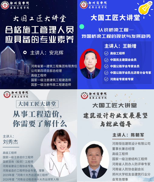 行业专家报告邀请了河南一建第四项目部总经理安兆辉,河南省造价工程师协会专家、理事刘秀杰,中国公路学会专家会员、高级工程师王新增以及河南恒信建筑设计有限公司总经理陈朝军分别从土木、工程造价、道桥等专业角度带来了四场精彩纷呈的报告。通过对建筑行业动态及市场环境进行分析,结合工程实例,指出未来行业发展需要专业过硬的技术复合型人才,引领学生全方位认识当前学生就业所必备的知识技能、技术技能及商务技能。最后,四位报告人勉励我院学生保持对专业的热爱,扎实学好专业课程,努力提高专业素养,合理规划个人的职业生涯,投身我国城市更新行动和基础设施建设,成长为复合型的工程人才。