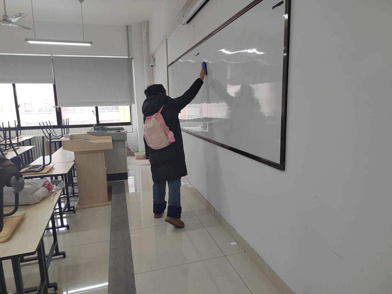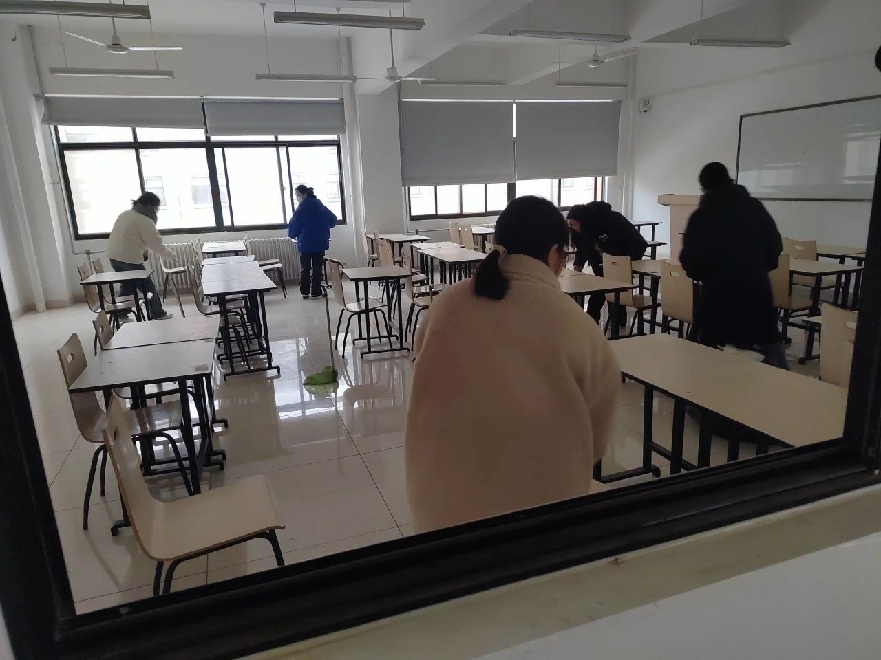 通过亲身体验,学生能够深入了解劳动的过程和价值,培养劳动习惯和动手能力,促进个人能力发展。团体劳动过程中,学生分工明确,各就其位,高质量高标准完成地面、黑板、桌椅的清洁工作。部分教室为封闭教室,不经常开放,为了让劳动教育更加全面,在打扫过程中学生对消防设施、多媒体设施、桌椅等教学设备进行检查,排除潜在安全隐患。确保考试环境的安全、卫生、有序和舒适,让beat365四六级考生享受舒适温馨的考试环境。