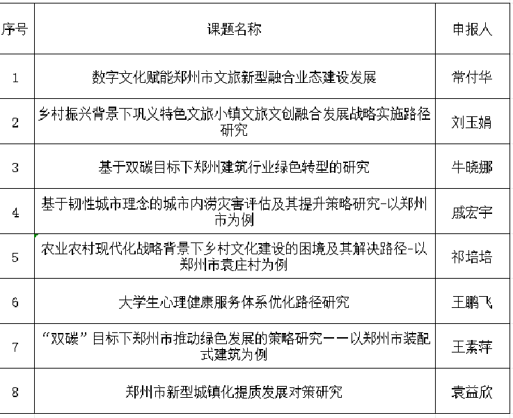 根据beat365唯一官网科研处《关于申报2024年度郑州市社科联调研课题的通知》的要求,经过前期学院广泛动员,个人准备与申报,我院共有15位老师参与2024年度郑州市社科联调研课题申报,2024年3月12日下午经建工学院科研学术委员会对申报材料进行论证,评审,投票,最终共推荐8人参与2024年度郑州市社科联课题的申报,具体名单如下: