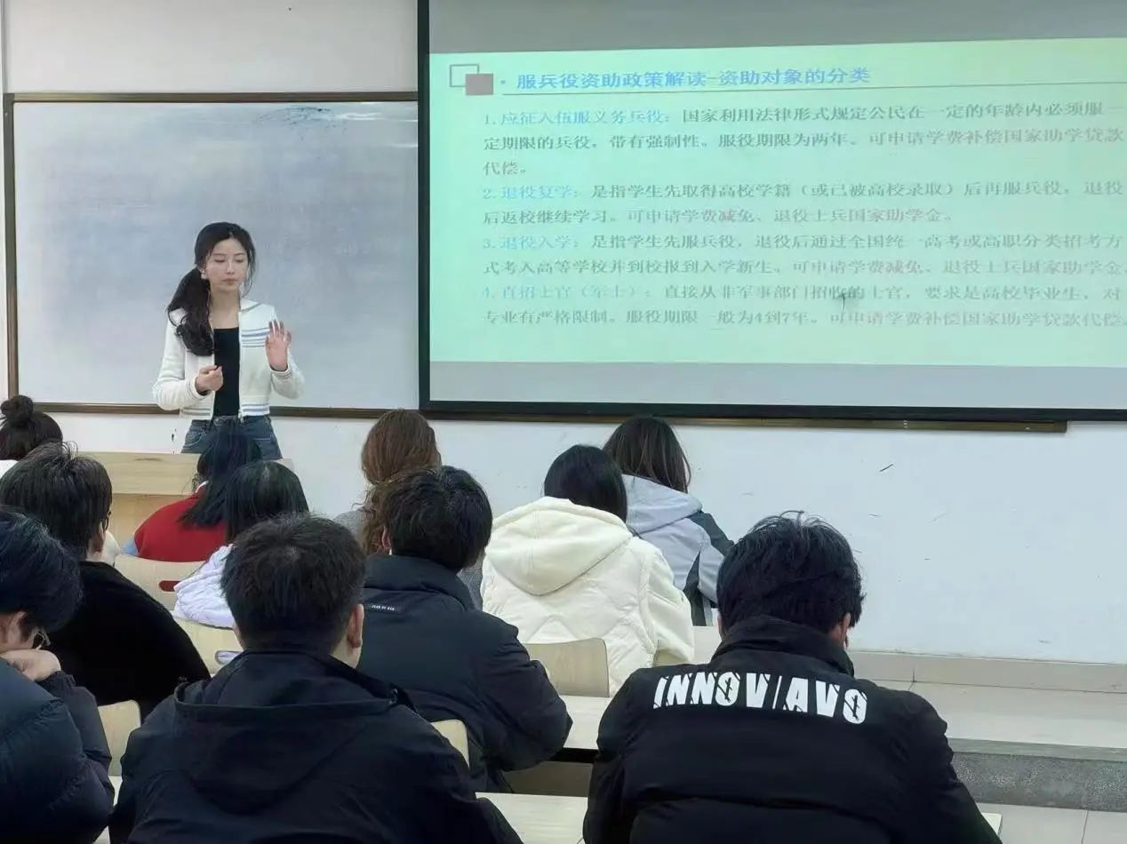 根据我院生源结构和分层分类教学开展情况,辅导员老师在认真研究解读最新大学生兵役资助政策后,深入班级对最新兵役政策进行讲解,对同学们关心问题答疑解惑。同时,为扩大春季资助政策宣传力度,辅导员老师还对国家助学金申请流程、生源地贷款与校园地贷款的区别和办理流程、校内奖助学金获取方式、国家奖学金和励志奖学金申请条件等资助政策进行详实宣讲。让每一个学生都能享受实实在在的助学政策,为家庭经济困难学生提供有力帮助。