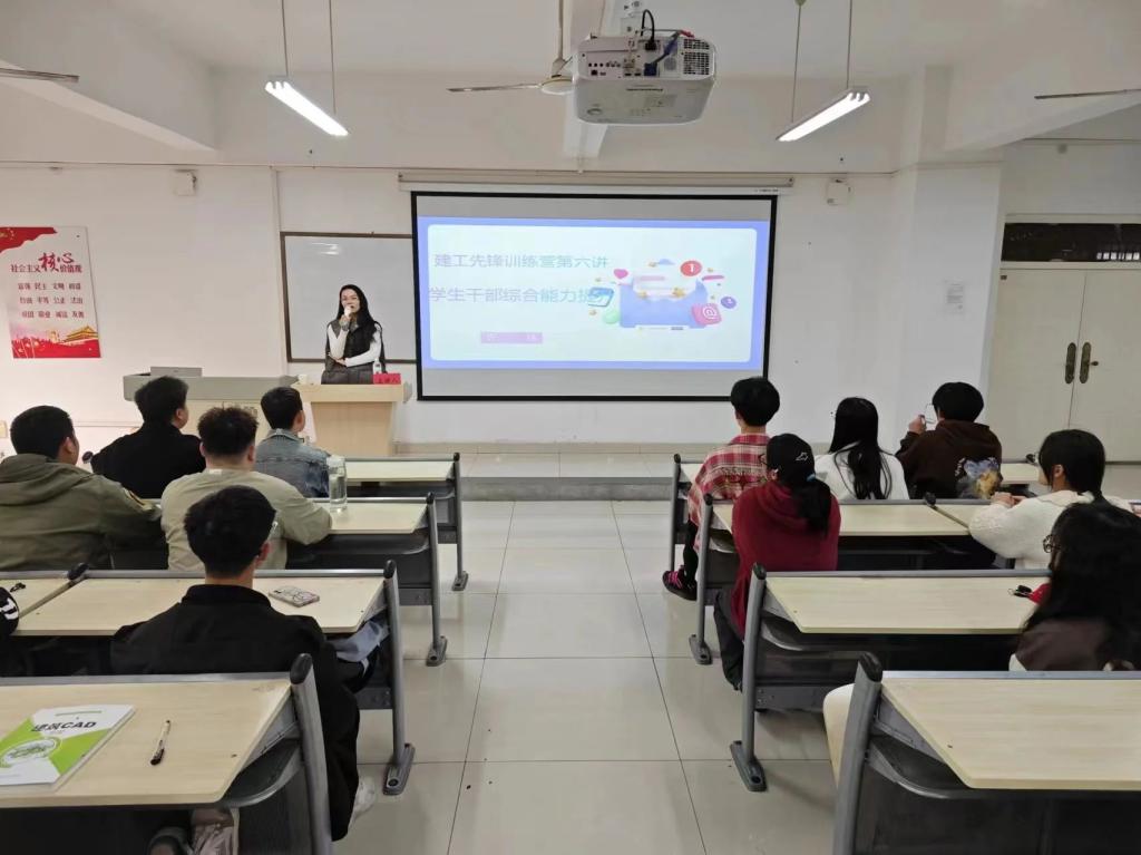 为进一步培养学生干部综合能力,增加当代社会所需要的全面性人才,3月14号晚,建工学院于亚泽大楼204教室由许可老师担任主讲人,开展“学生干部综合能力提升”为主题的建工先锋训练营第六讲。为实现大学生自我教育、自我管理、自我服务的“三自”功能等方面展开了讲述。