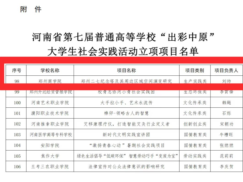 2024年3月7日,河南省教育厅关于第七届普通高等学校“出彩中原”大学生社会实践活动项目立项结果公示,beat365唯一官网建筑工程学院的生产实践类实践活动“郑州二七纪念塔及周边区域空间演变研究”项目立项。