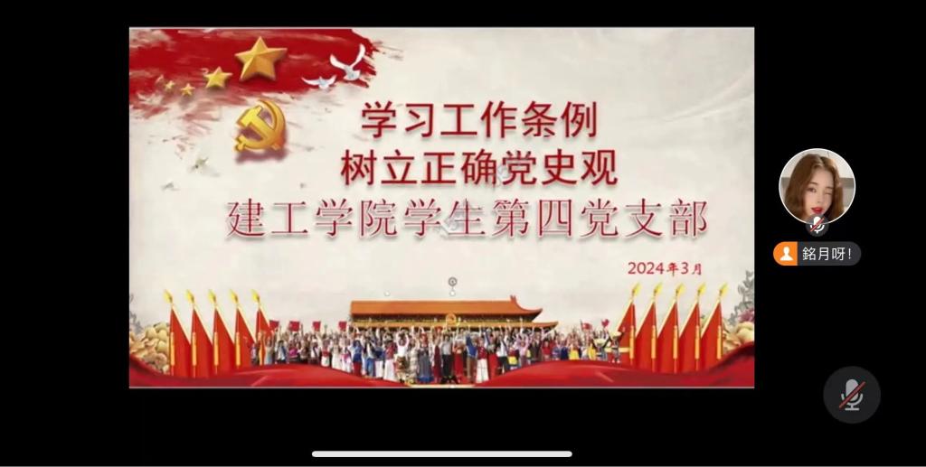 为深入学习贯彻习近平新时代中国特色社会主义思想,传承红色基因,延续革命精神,厚植爱国主义情怀,2024年3月15日晚19点,建筑工程学院学生第四党支部在腾讯会议召开以“学习工作条例,树立正确党史观”为主题的党日活动。
