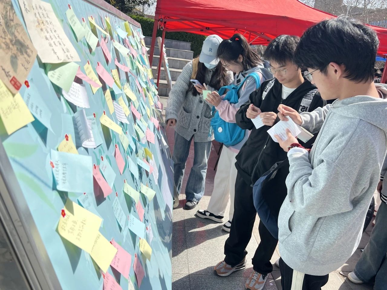 活动中,同学们积极参加,同学们将自己的心愿与祝福写在便签上,热烈的表达对春天的赞美和热爱,以及对美好未来的展望。