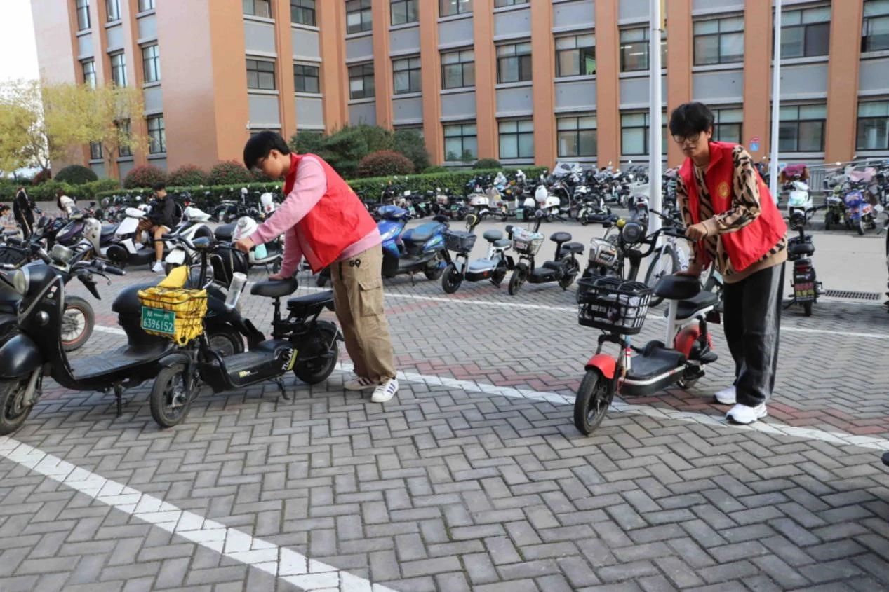 志愿者在早上和中午的课前进行电动车辆停放的规范检查,对停放不规范的电动车辆进行挪移和规范停放,确保车辆停放不影响道路交通。