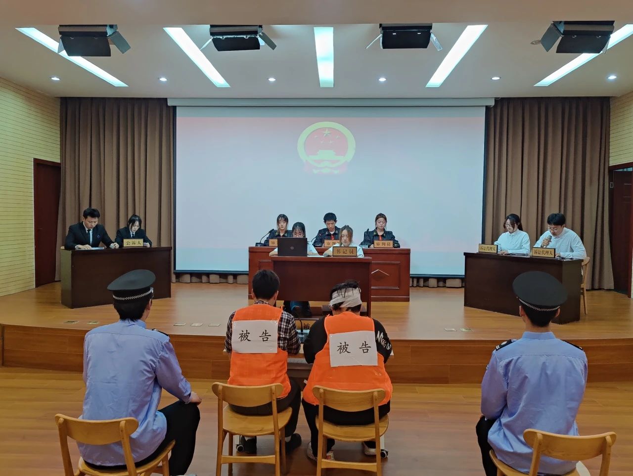 本次普法活动以模拟法庭的形式进行,分为六个阶段,首先是开庭,各演职人员上场,由书记员宣读庭审记录以及在庭审过程中的注意事项;接着进入案件调查与辩论阶段,由公诉人陈述案件经过,被告陈述事实,由公诉人提交相关证据,由辩论员为被告辩论,最终结果由审判长定夺;最后宣判结果,审判长对两名被告进行法庭教育。