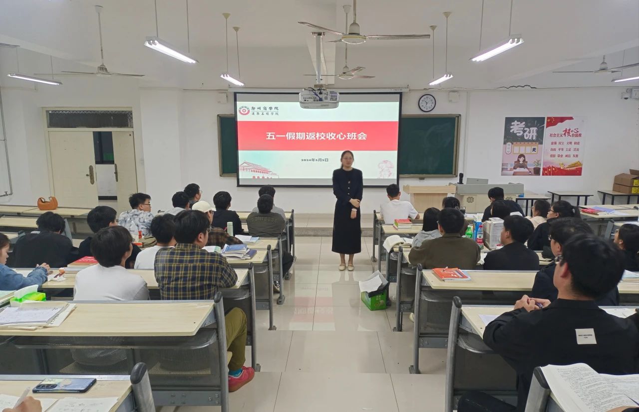 辅导员老师按照工作部署会要求召开五一假期收心班会,从纪律、学习等方面对学生们提出新希望、新要求,希望同学们尽快收心,明确目标,全力拼搏,成为更好的自己。