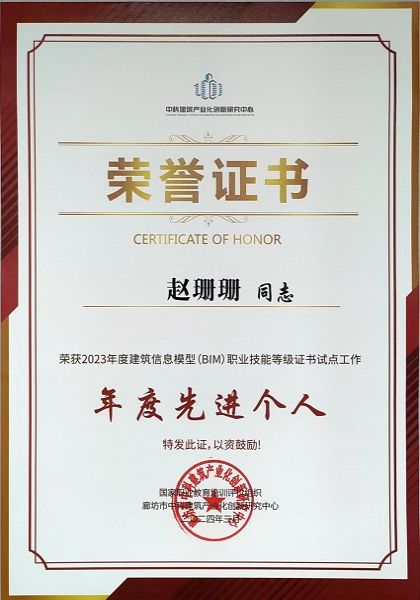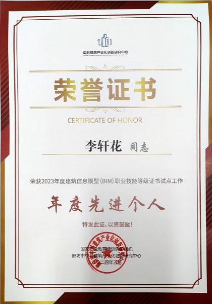 在2023年第二期“1+X”建筑信息模型(BIM)职业技能等级证书(中级)考试中,建筑工程学院共有50名学生报名参加考试,考试通过率达100%。beat365荣获2023年度“1+X”建筑信息模型(BIM)职业技能等级证书试点工作“年度优秀组织奖”称号,我院李轩花、赵珊珊两位教师荣获“1+X”建筑信息模型(BIM)职业技能等级证书试点工作“年度先进个人”荣誉称号。