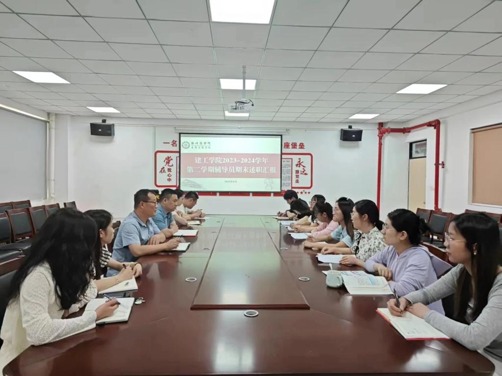 为充分发挥辅导员考核的激励导向作用,总结经验,交流共享,梳理总结2023-2024学年第二学期学院工作情况,强化考核机制,深化改革创新,进一步加强我院辅导员队伍建设,改进本学期工作及交流学风建设方法,明确下一学期工作计划与目标,建工学院于6月13日在亚泽楼113会议室召开2023-2024学年第二学期辅导员期末工作汇报。建工学院党委书记朱宏东、团委书记刘帅以及全体辅导员参加会议。
