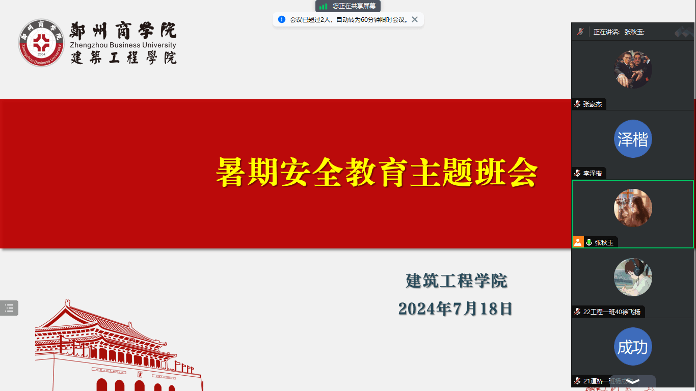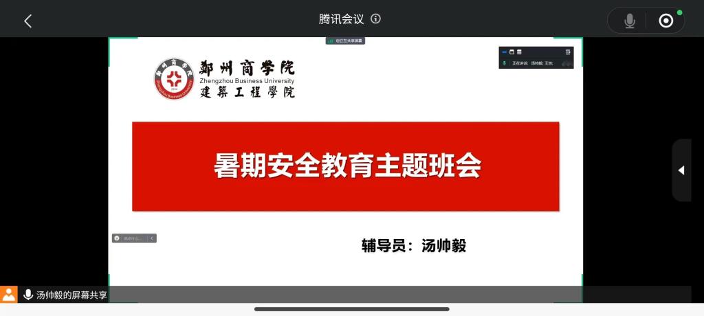 为进一步加强暑期安全建设,积极做好假期安全稳定工作,确保校外学生度过一个安全、愉快、有意义的假期,帮助留校考研学生营造安全学习环境,7月18日,我院多角度发力,面向全体学生召开线上暑假安全教育主题班会,全力护航广大学生的暑假之旅。本次班会以假期安全教育为主题,由辅导员亲自主持,引导学生学习假期安全知识。