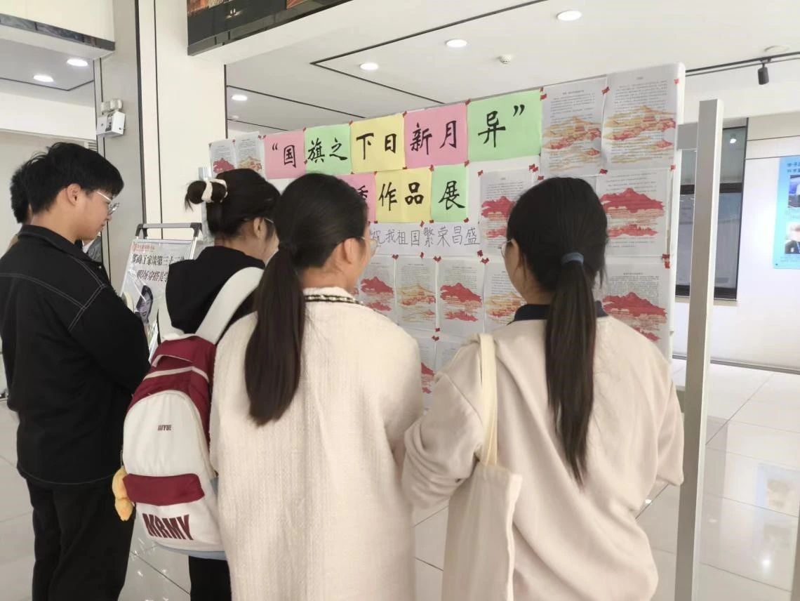 展板上佳作琳琅,每一篇作品,都是一颗璀璨的诗星,照亮祖国的辉煌历程。爱国与书香沁满校园,推动着我院的学风建设,激励众多学子积极关注祖国发展,从而更富有热情地投入到书香氛围中。