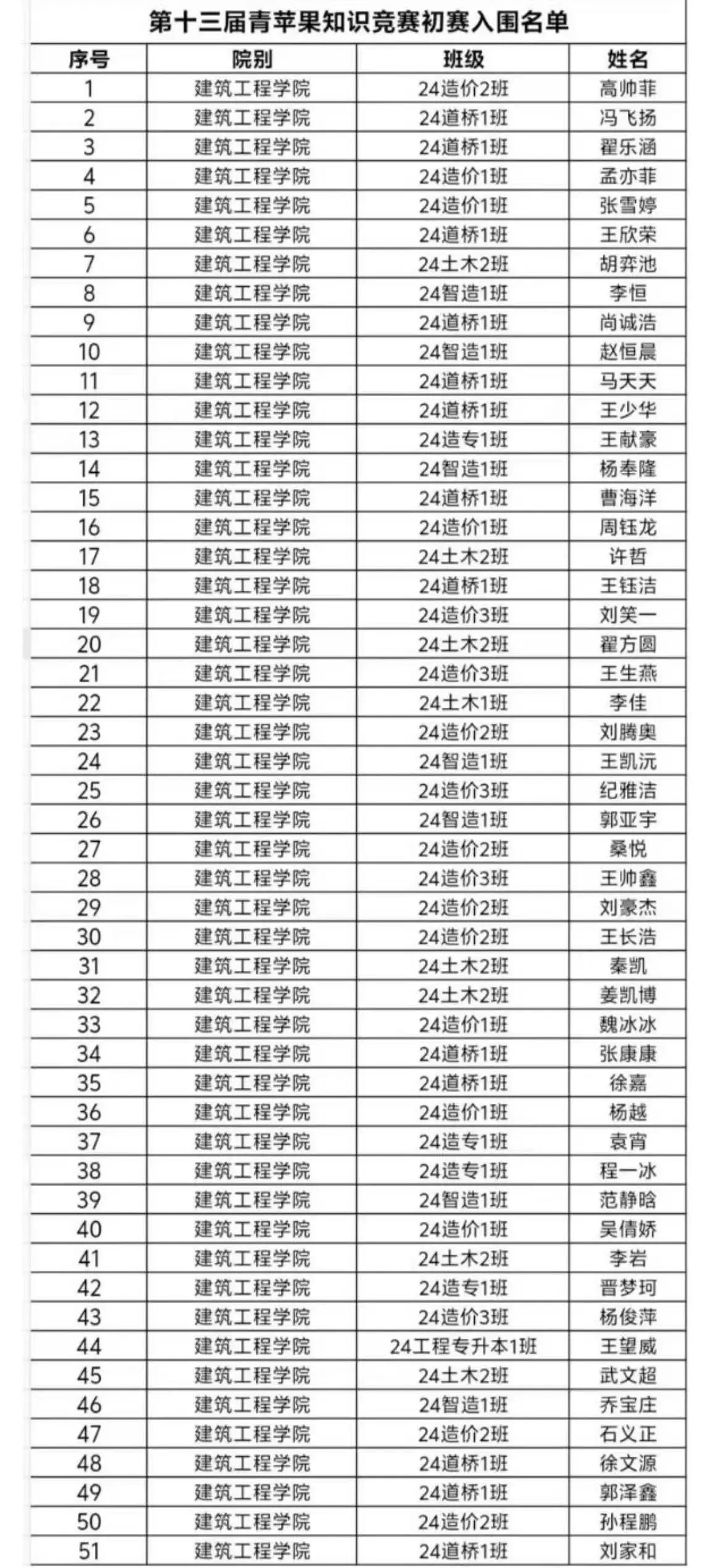 在激烈的竞赛氛围中,学生们沉着应对,认真作答,不仅彰显了他们坚实的知识功底与出色的竞技风貌,还凸显了建工学院考风考纪良好的作风。随着考试的落幕,组织团队对试卷进行了细致评估,严格筛选,最终确定了51名同学脱颖而出,成功晋级校赛初赛,并在群内公布。