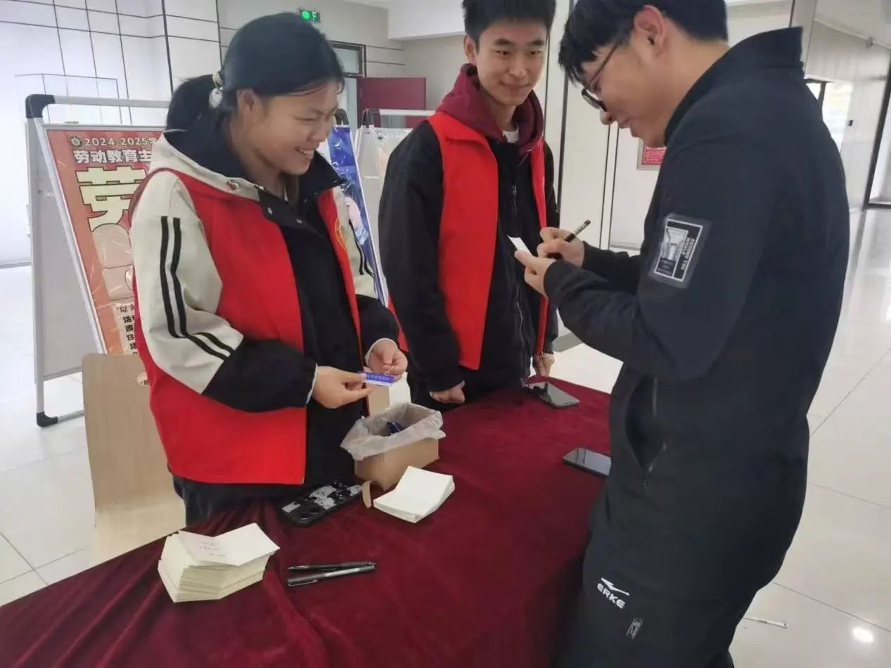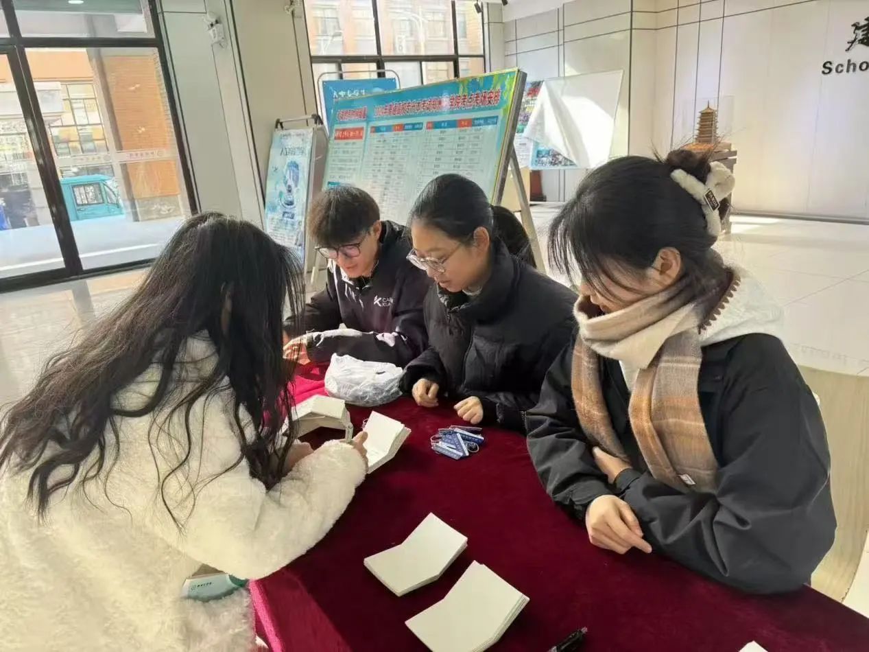 活动前,志愿者们提前布置好场地,摆放好明信片与黑色签字笔,静待同学们的到来。活动期间,同学们在明信片上一笔一划的书写,温暖传情。随后,同学们领取此次活动的纪念品。“良言一句三冬暖”,这些话语在凛冽的寒冬中,为同学们带来温暖。活动结束后,一部分便签将通过整理收集,传递给那些被牵挂、被祝福的对象;另一部分则会被精心展示在公共区域,让更多人感受到这份浓浓的爱意与温情。