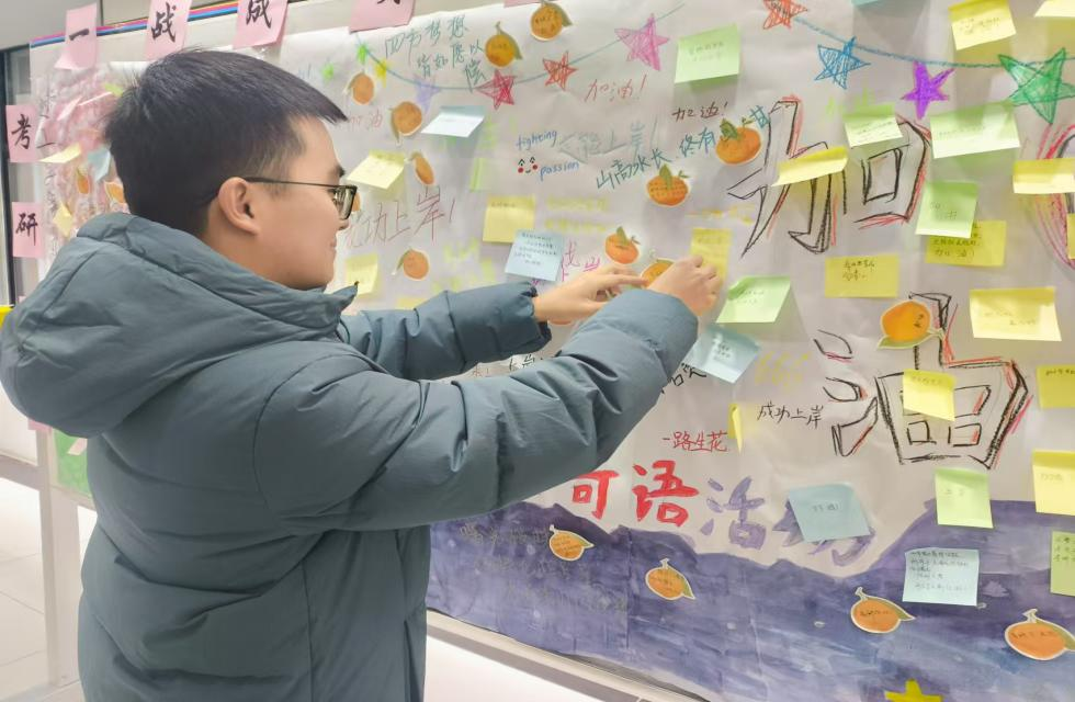 为增强考研学子的信心,鼓舞士气,同时激发考研学子们的斗志,让他们感受到来自学院的温暖与力量。12月11日,建筑工程学院于亚泽楼一楼大厅举办“一战成硕,一‘研’为定”考研加油寄语活动。