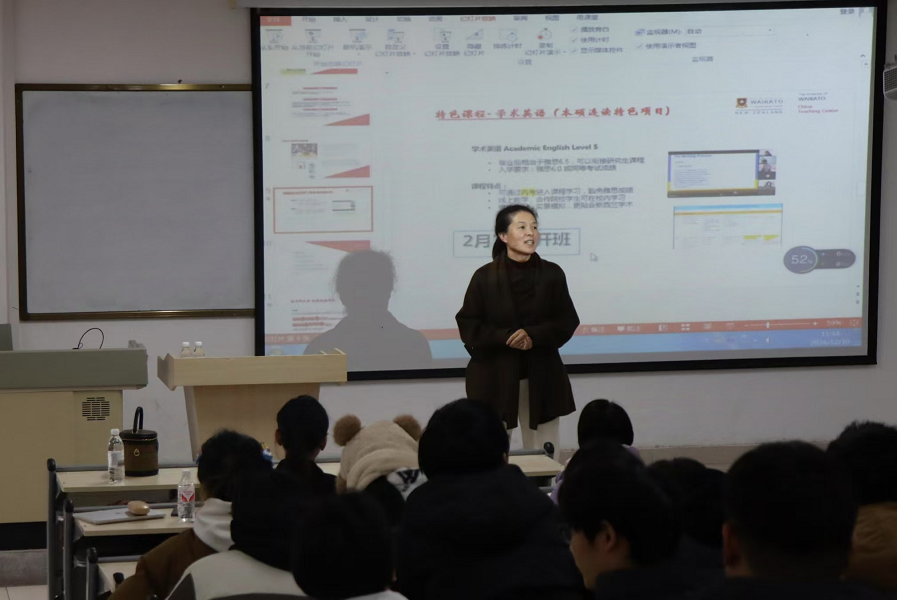 随后,新西兰怀卡托大学中国教学中心中国区负责人朱姝颖老师为学生们详细介绍了怀托卡大学中工程实践硕士、工程硕士的就业前景,通过校园特色、校园设施、特色课程、未来发展前景等多个维度,使学生清晰了解怀卡托大学的升硕项目。