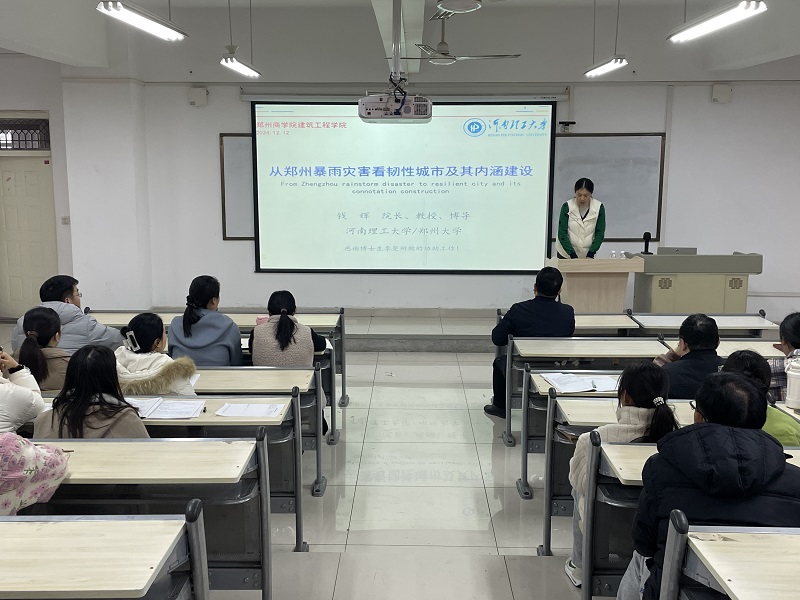 2024年12月12日下午,河南理工大学土木工程学院院长、博士生导师钱辉教授莅临我院开展题为“从郑州暴雨灾害看韧性城市及其内涵建设”的学术讲座。建筑工程学院院长张燕燕、副院长叶灵云和全体无课教师及相关专业本科生参加了此次活动。本次学术讲座由建筑工程学院院长张燕燕副教授主持。