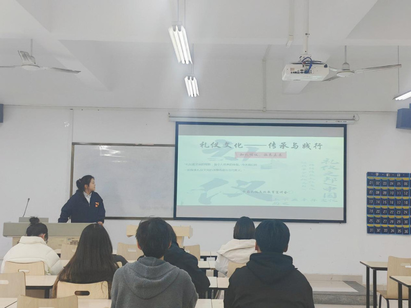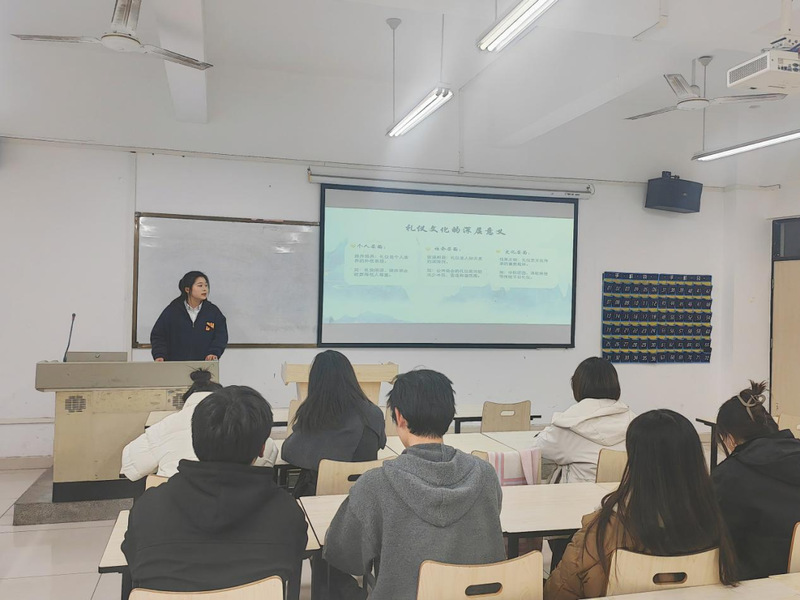 首先,主持人通过PPT展示,详细阐述了现代大学生在不同场景下的礼仪规范。在校园中,讲到了在图书馆如何保持安静、在食堂如何文明就餐等细节;在课堂中,说明了文明上课、尊重课堂的重要性;在社交方面,强调了与不同身份的人交往时的语言礼仪和肢体语言礼仪,如眼神交流的重要性、微笑的恰当运用等。