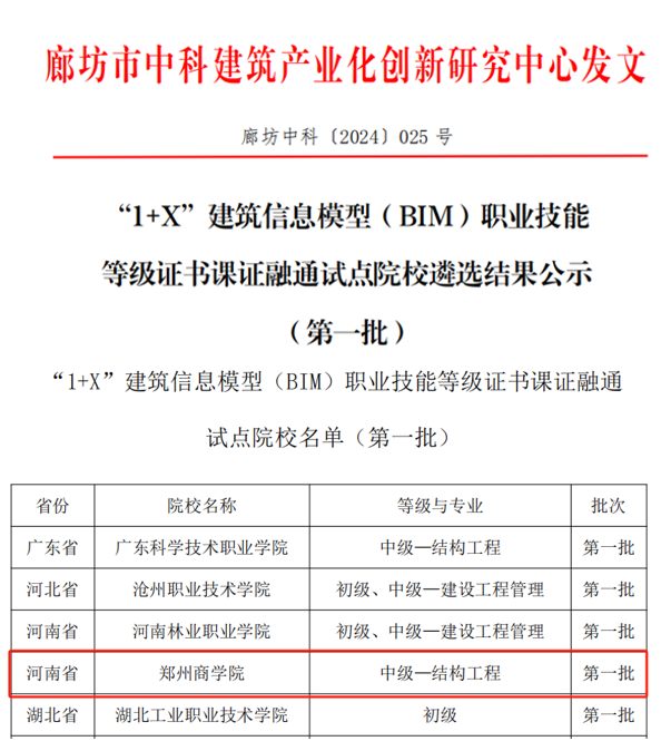 智能建造学院成功入选第一批“1+X”建筑信息模型(BIM)职业技能等级证书课证融通试点院校