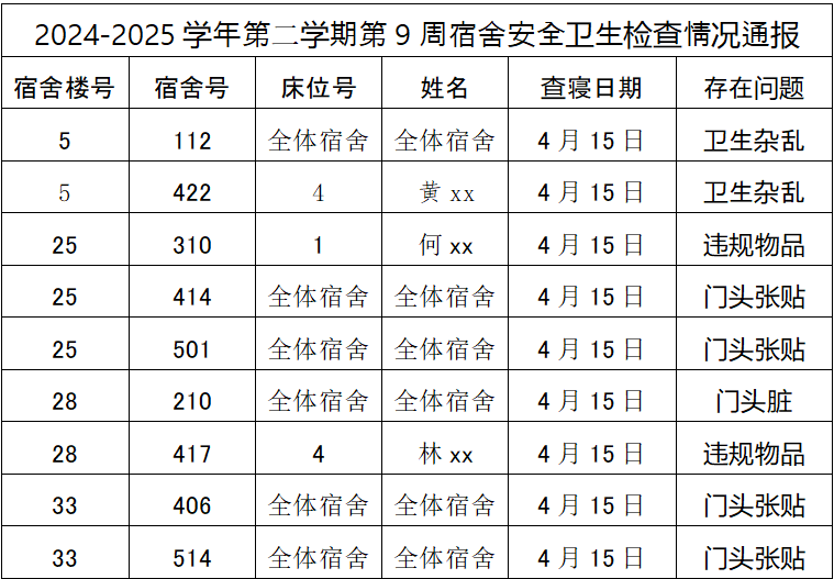 为督促同学们养成良好的安全和卫生习惯,激发广大学生的共建热情,改变我院学生宿舍安全和卫生状况,给同学们创造一个干净、舒适、整洁、卫生、文明的住宿环境。现将第9周宿舍检查情况通报如下: