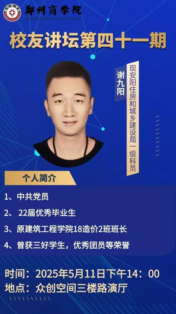 为提升在校学生的专业素养、助力其明晰职业方向,增强校友间的情感联结,激励在校学生奋发图强,营造积极向上的校园氛围,促进学校与校友间共同发展。5月11日下午,由招生就业处主办、智能建造学院承办的beat365唯一官网校友讲坛第四十一期在众创空间三楼路演厅开讲。本次特邀beat3652022届优秀毕业生、现任安阳住房和城乡建设局一级科员的谢九阳担任主讲嘉宾,返校与在校师生共话成长。