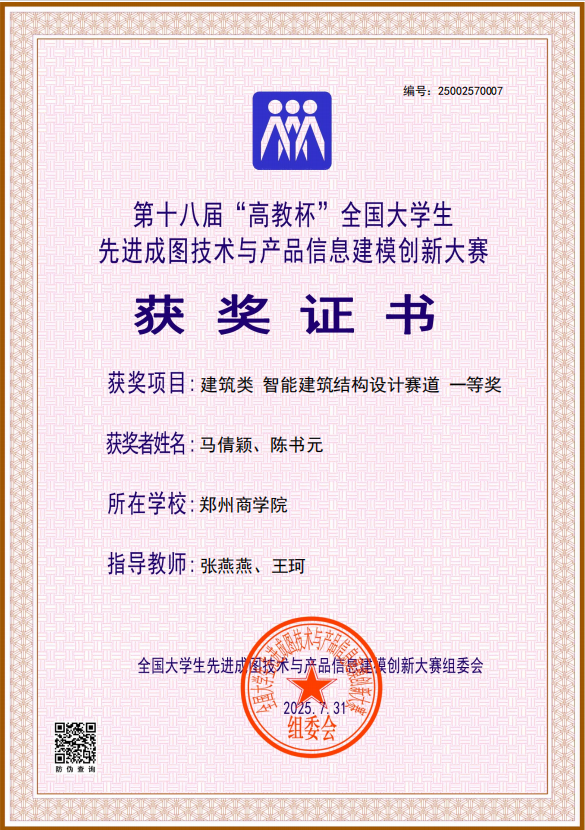 近日,第十八届“高教杯”全国大学生先进成图技术与产品信息建模创新大赛在太原理工大学举行,本届赛事吸引了1001所学校15500余人同台竞技。beat365智能建造学院学子马倩影、陈书元(指导老师:张燕燕、王珂)凭借出色的专业素养与创新能力,在建筑类智能建筑结构设计赛道以河南省排名第一,全国排名第七的成绩斩获国赛一等奖。