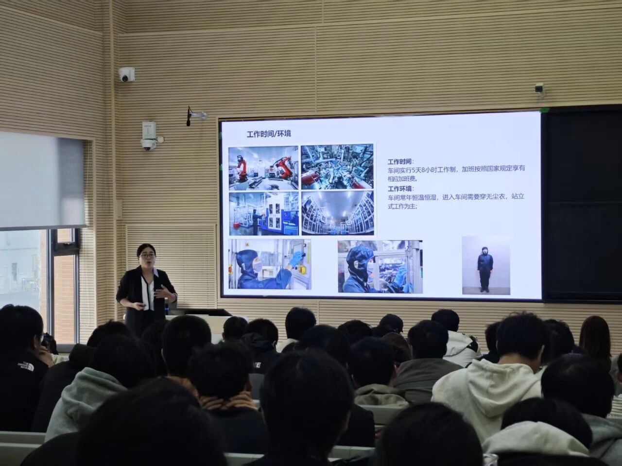 四家企业代表依次上台,通过 PPT 演示、视频播放等形式,向在场学生详细介绍了企业的发展历程、核心业务、企业文化、岗位需求、薪资福利及晋升空间。